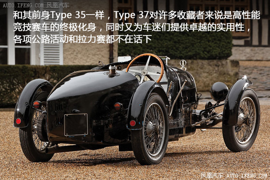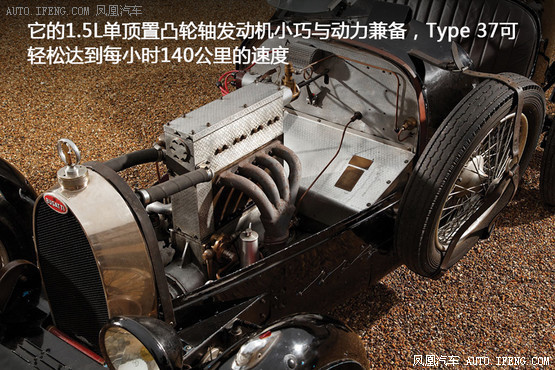 Type 37巧妙地将主旨鲜明的美观造型和含蓄简约融为一体,凭借精湛的工艺和轻型设计实现性能的提升,而不是像当时众多赛车那样一味依靠蛮力。它的1.5L单顶置凸轮轴发动机小巧与动力兼备,Type 37可轻松达到每小时140公里的速度,再加上其制动系统在当时也十分出色,所以这款车型一度被公认为国际系列赛事中稳操胜券的王牌。